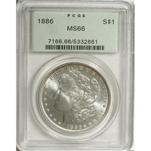 <B>1886 $1 MS66 PCGS.</B></I> PCGS Population (2013/203). NGC Census: (3512/576). Mintage: 19,963,886. Numismedia Wsl. Price for NGC/PCGS coin in MS66: $300. (#7166)<BR><BR><B>Coin Engraver:</B> George T. Morgan<BR><BR><b>Shipping:</b> Coins & Currency (<a target="_blank" href="http://www.heritageauctions.com/common/shipping.php">view shipping information</a>)