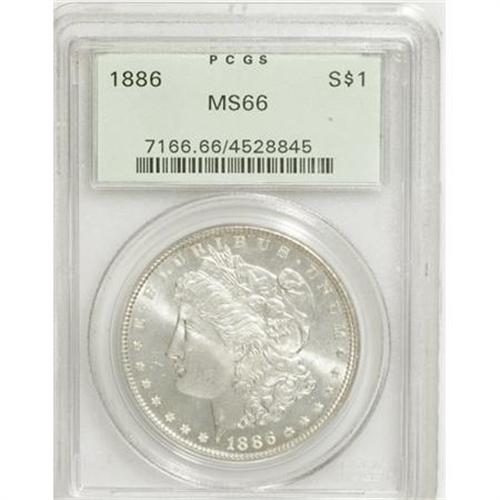 <B>1886 $1 MS66 PCGS.</B></I> PCGS Population (2015/203). NGC Census: (3512/576). Mintage: 19,963,886. Numismedia Wsl. Price for NGC/PCGS coin in MS66: $300. (#7166)<BR><BR><B>Coin Engraver:</B> George T. Morgan<BR><BR><b>Shipping:</b> Coins & Currency (<a target="_blank" href="http://www.heritageauctions.com/common/shipping.php">view shipping information</a>)
