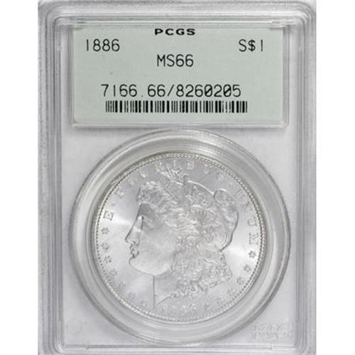 <B>1886 $1 MS66 PCGS.</B></I> . PCGS Population (2042/203). NGC Census: (3570/587). Mintage: 19,963,886. Numismedia Wsl. Price for NGC/PCGS coin in MS66: $300. (#7166)<BR><BR><B>Coin Engraver:</B> George T. Morgan<BR><BR><b>Shipping:</b> Coins & Currency (<a target="_blank" href="http://www.heritageauctions.com/common/shipping.php">view shipping information</a>)