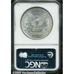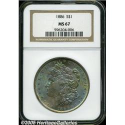 <B>1886<img border='0' src='http://www.heritagecoins.com/images/star.gif' width=10 height=10>$1 MS67 NGC.</B></I> Sharply struck with a rich coating of variegated turquoise-green, amber, and yellow-golden toning, on the obverse, and a bright, untoned reverse. Both sides of the coin are well preserved and only display two or three small blemishes.