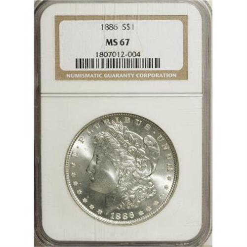 <B>1886 $1 MS67 NGC.</B></I> This boldly struck Superb Gem has an unabraded cheek and an untoned appearance. Scintillating luster ensures a lofty grade. Each side has only a whisper of tan toning.<BR><I>From the Reuben Reinstein Collection.</B></I><BR><BR><b>Shipping:</b> Coins & Currency (<a target="_blank" href="http://www.heritageauctions.com/common/shipping.php">view shipping information</a>)