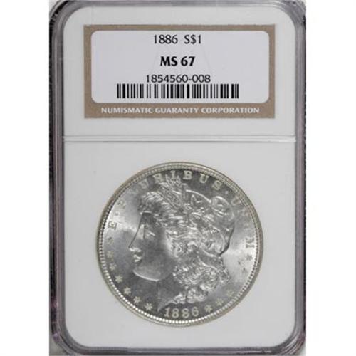 <B>1886 $1 MS67 NGC.</B></I> Crisply struck with outstanding luster and minimal patina, this Superb Gem manages to improve on the already impressive quality of many examples of this popular P-mint issue. Attractive and practically devoid of marks. NGC has certified only eight pieces finer (7/07).<BR><BR><B>Coin Engraver:</B> George T. Morgan<BR><BR><b>Shipping:</b> Coins & Currency (<a target="_blank" href="http://www.heritageauctions.com/common/shipping.php">view shipping information</a>\)