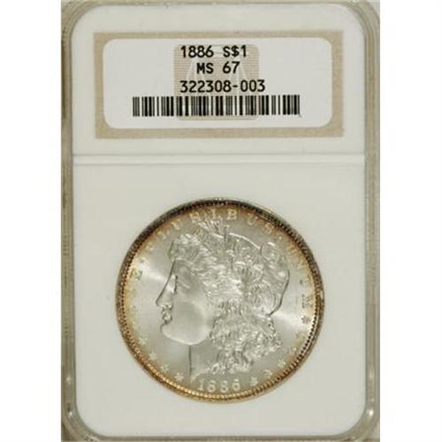 <B>1886 $1 MS67 NGC.</B></I> Well struck, highly lustrous, and nearly pristine, with lovely reddish-brown peripheral toning on the obverse that increases the eye appeal of the piece. A common date which becomes relatively uncommon at the Superb Gem level of preservation. <BR><BR><B>Coin Engraver:</B> George T. Morgan<BR><BR><b>Shipping:</b> Coins & Currency (<a target="_blank" href="http://www.heritageauctions.com/common/shipping.php">view shipping information</a>)