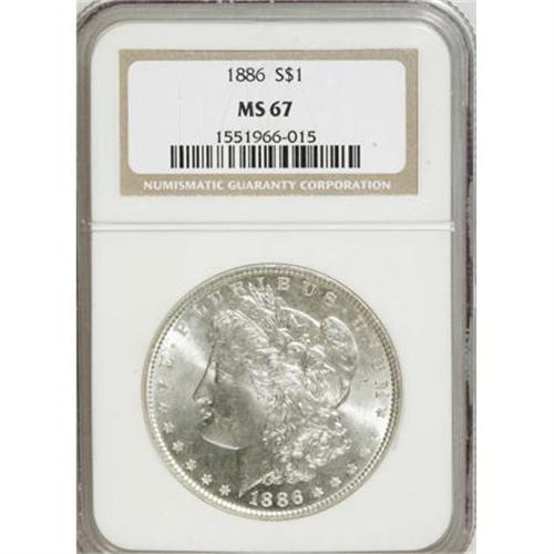 <B>1886 $1 MS67 NGC.</B></I> A Superb Gem that is seldom exceeded for quality. This dollar has brilliant silver surfaces and sharp design definition. An exceptional example. NGC has only certified eight finer examples (12/07).<BR><BR><B>Coin Engraver:</B> George T. Morgan<BR><BR><b>Shipping:</b> Coins & Currency (<a target="_blank" href="http://www.heritageauctions.com/common/shipping.php">view shipping information</a>)