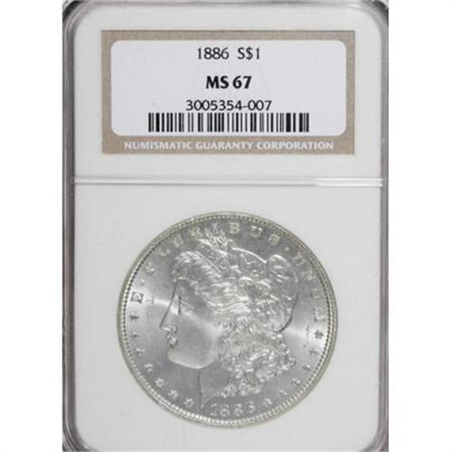 <B>1886 $1 MS67 NGC.</B></I> A simply wonderful Superb Gem that displays vibrant luster and exquisitely struck design elements. Remarkably smooth surfaces are essentially untoned.<BR><BR><B>Coin Engraver:</B> George T. Morgan<BR><BR><b>Shipping:</b> Coins & Currency (<a target="_blank" href="http://www.heritageauctions.com/common/shipping.php">view shipping information</a>)