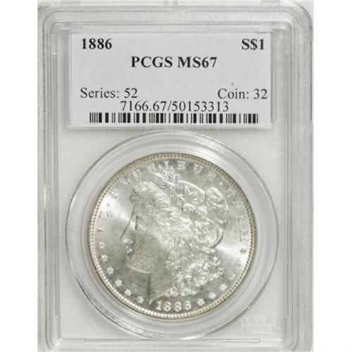 <B>1886 $1 MS67 PCGS.</B></I> While this silver-white piece is not at the top of the Condition Census of certified survivors, the several hundred MS67 pieces certified at both services are near, as there are only 11 MS68s combined, a figure that almost certainly includes numerous duplications. Beautiful cartwheel luster radiates from both sides.<BR><I>From The Motor City Collection.</B></I><BR><BR><B>Coin Engraver:</B> George T. Morgan<BR><BR><b>Shipping:</b> Coins & Currency (<a target="_blank" href="http://www.heritageauctions.com/common/shipping.php">view shipping information</a>)
