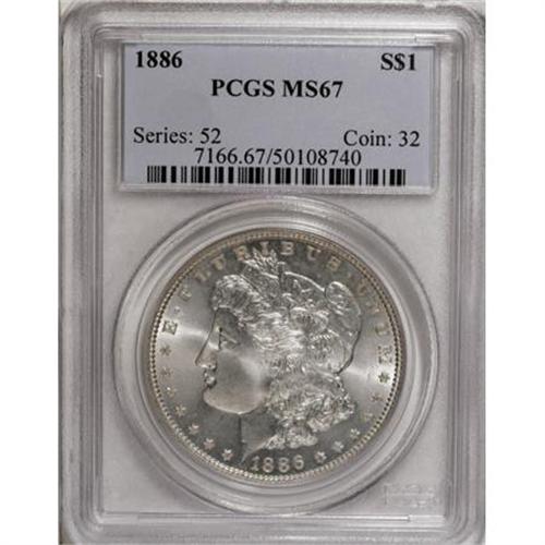 <B>1886 $1 MS67 PCGS.</B></I> Pleasingly detailed with powerful luster. Just a touch of golden toning visits the beautifully preserved and shining surfaces. PCGS has graded just three finer pieces (1/08).<BR><I>From The Jimmy G. PCGS Registry Collection of Morgan Dollars with Varieties.</B></I><BR><BR><B>Coin Engraver:</B> George T. Morgan<BR><BR><b>Shipping:</b> Coins & Currency (<a target="_blank" href="http://www.heritageauctions.com/common/shipping.php">view shipping information</a>)