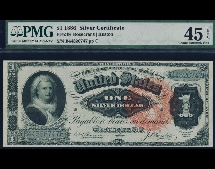 One 1886 $1 Martha Washington Silver Cert PMG 45EPQ.