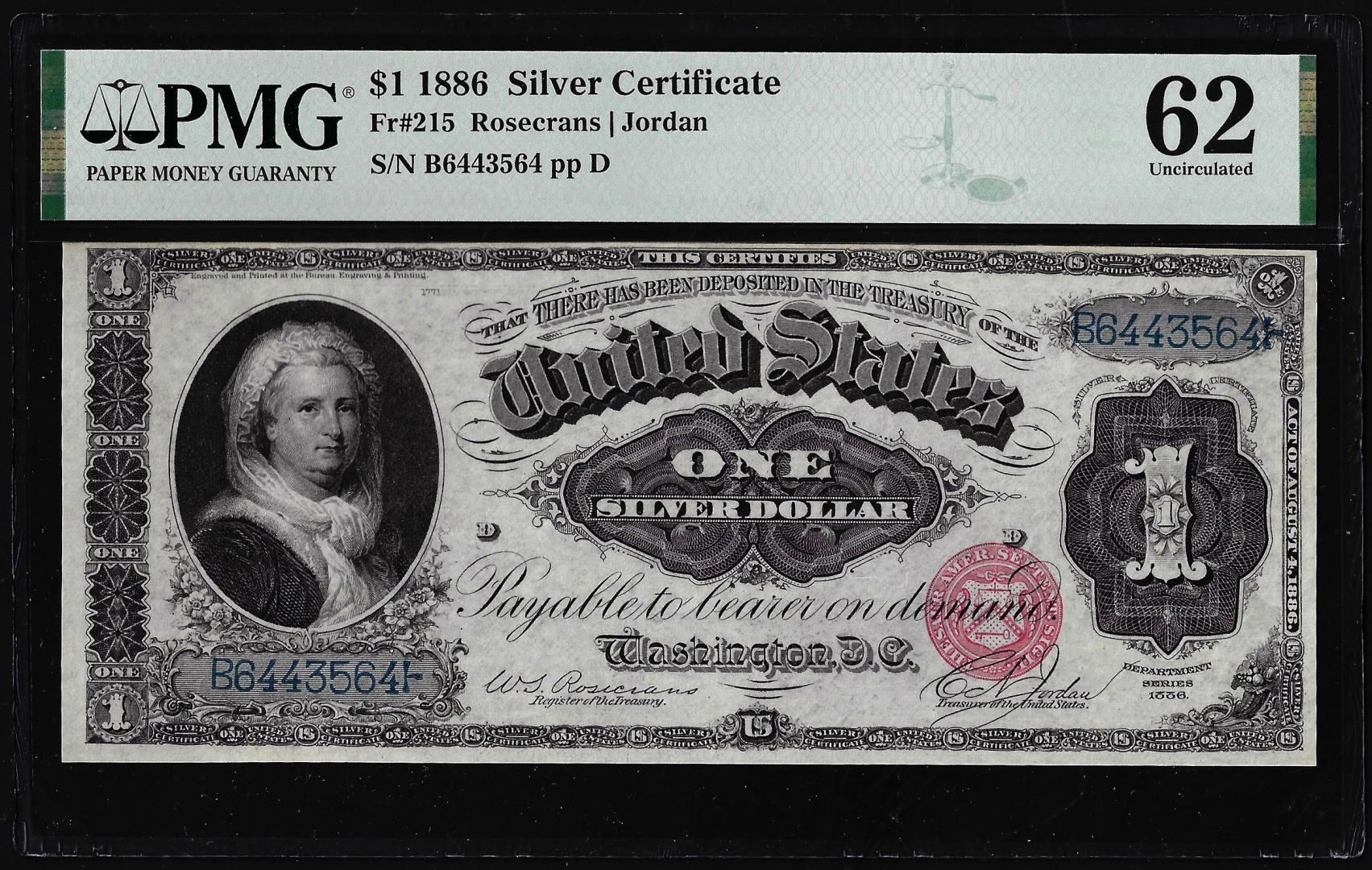 One 1886 $1 Martha Washington Silver Certificate Note Fr.215 PMG Uncirculated 62. PMG Certified.