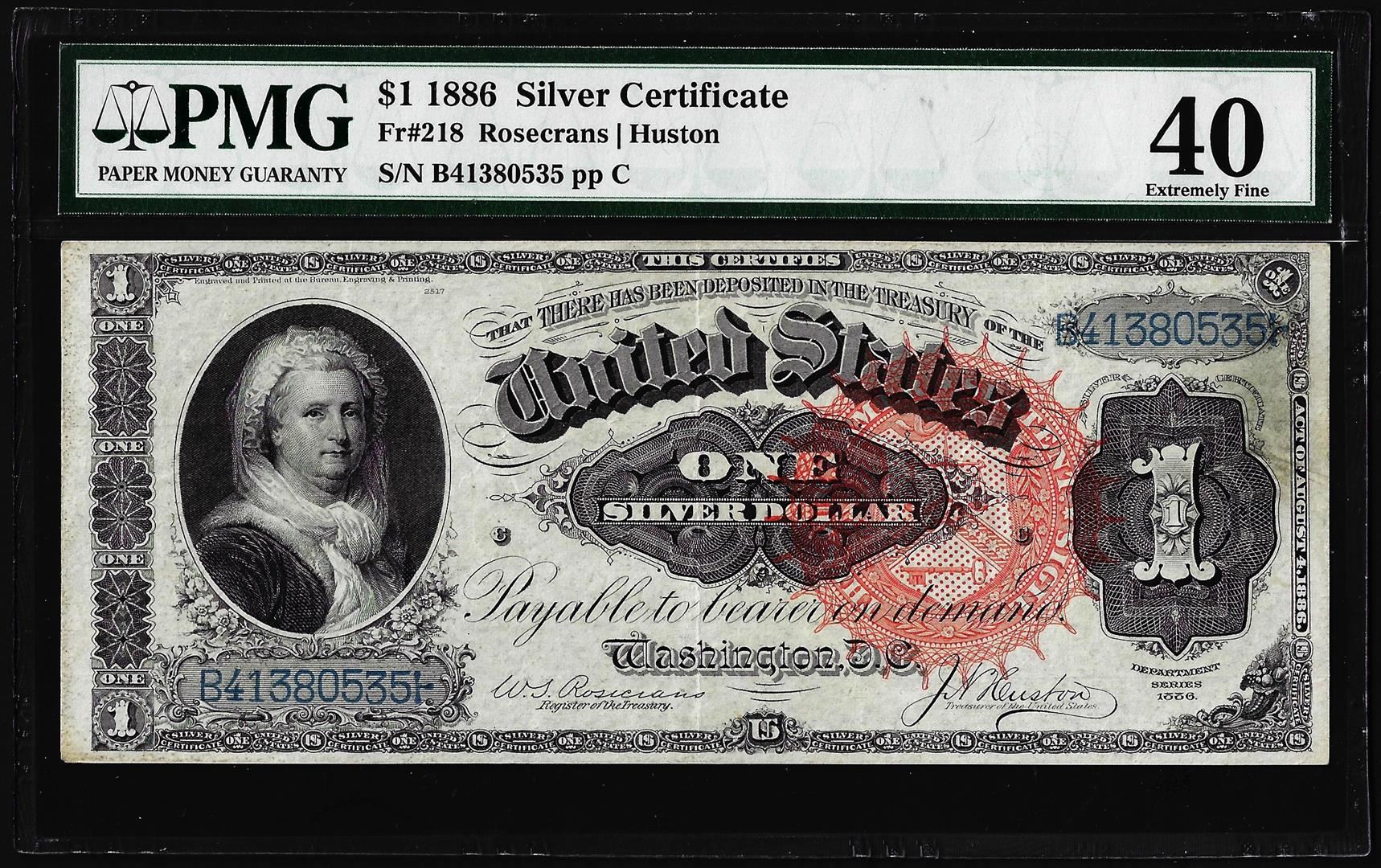 One 1886 $1 Martha Washington Silver Certificate Note Fr.218 PMG Extremely Fine 40. PMG Certified.
