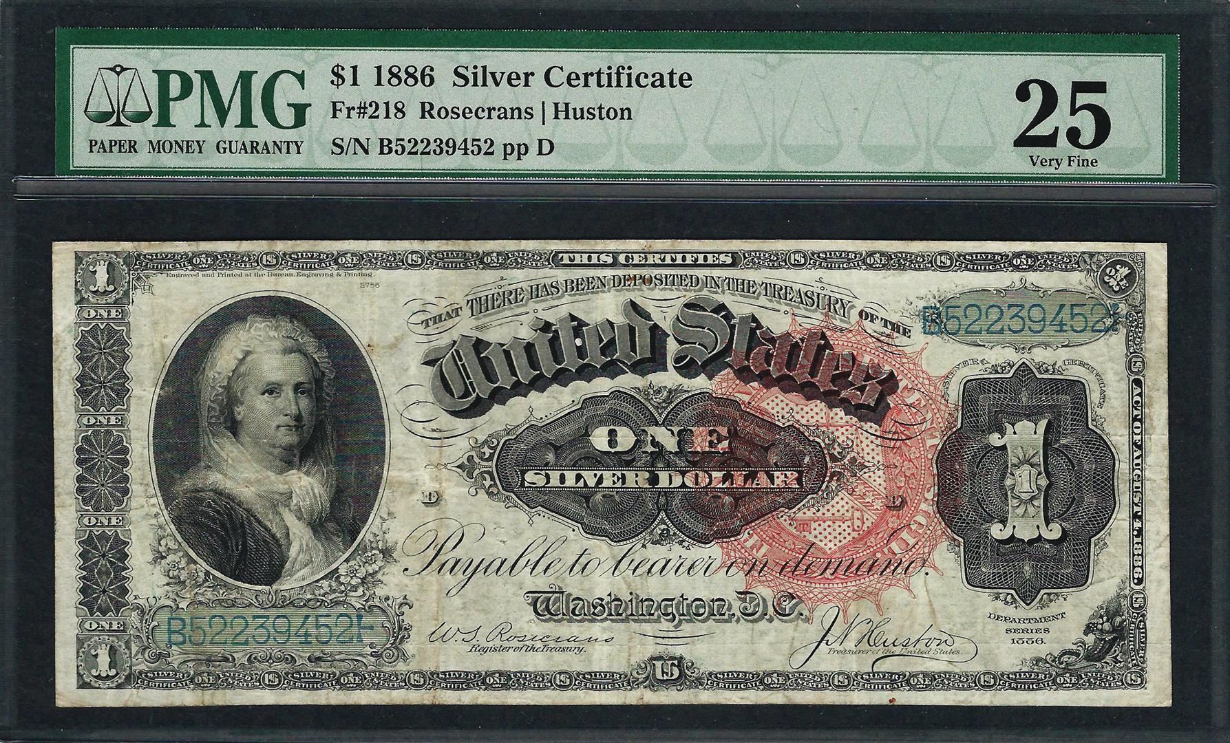 One 1886 $1 Martha Washington Silver Certificate Note Fr.218 PMG Very Fine 25. PMG Certified.
