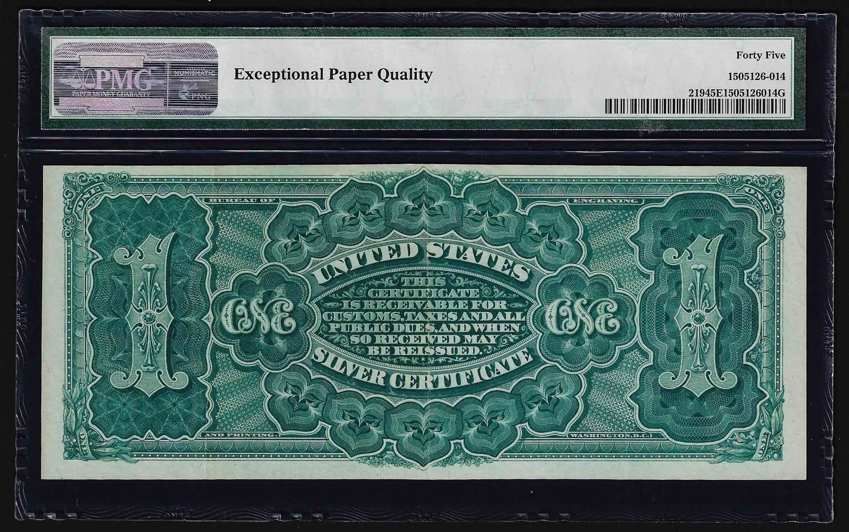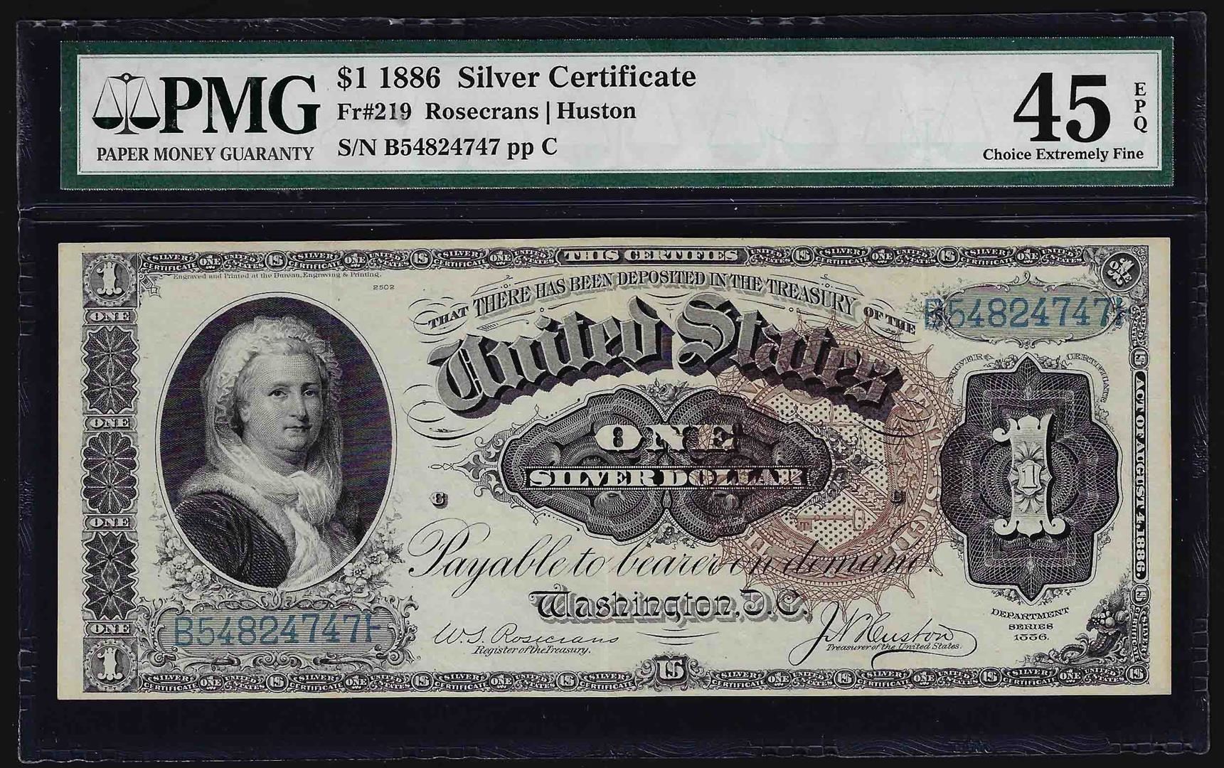 One 1886 $1 Martha Washington Silver Certificate Note PMG Choice Extremely Fine 45EPQ. PMG Certified.