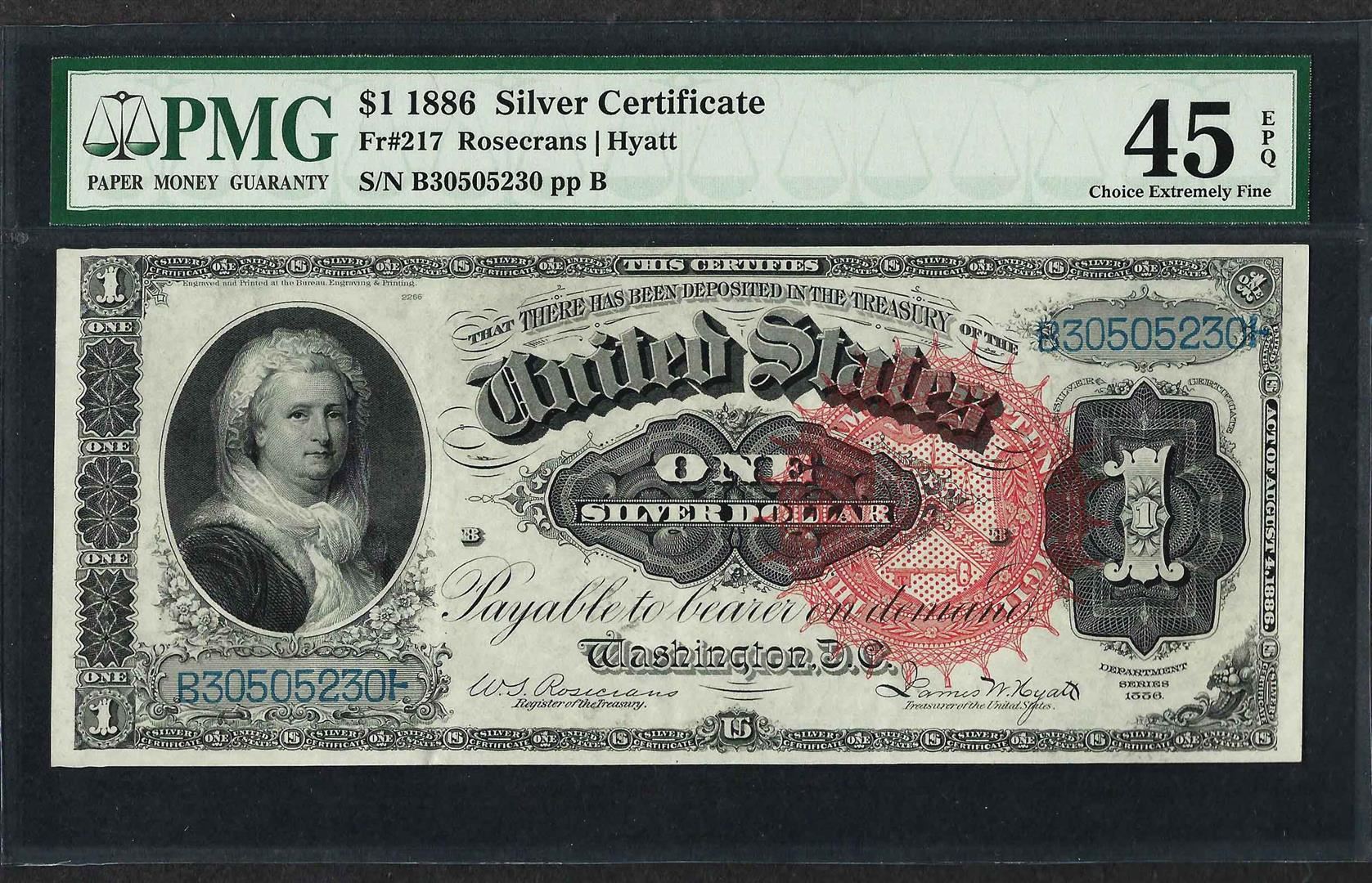 One 1886 $1 Martha Washington Silver Certificate Note PMG Choice Extremely Fine 45EPQ. PMG Certified.