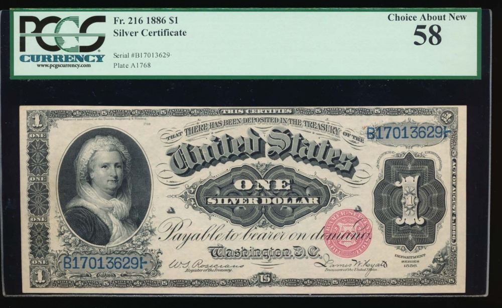 One 1886 $1 Martha Washington Silver Certificate PCGS 58.