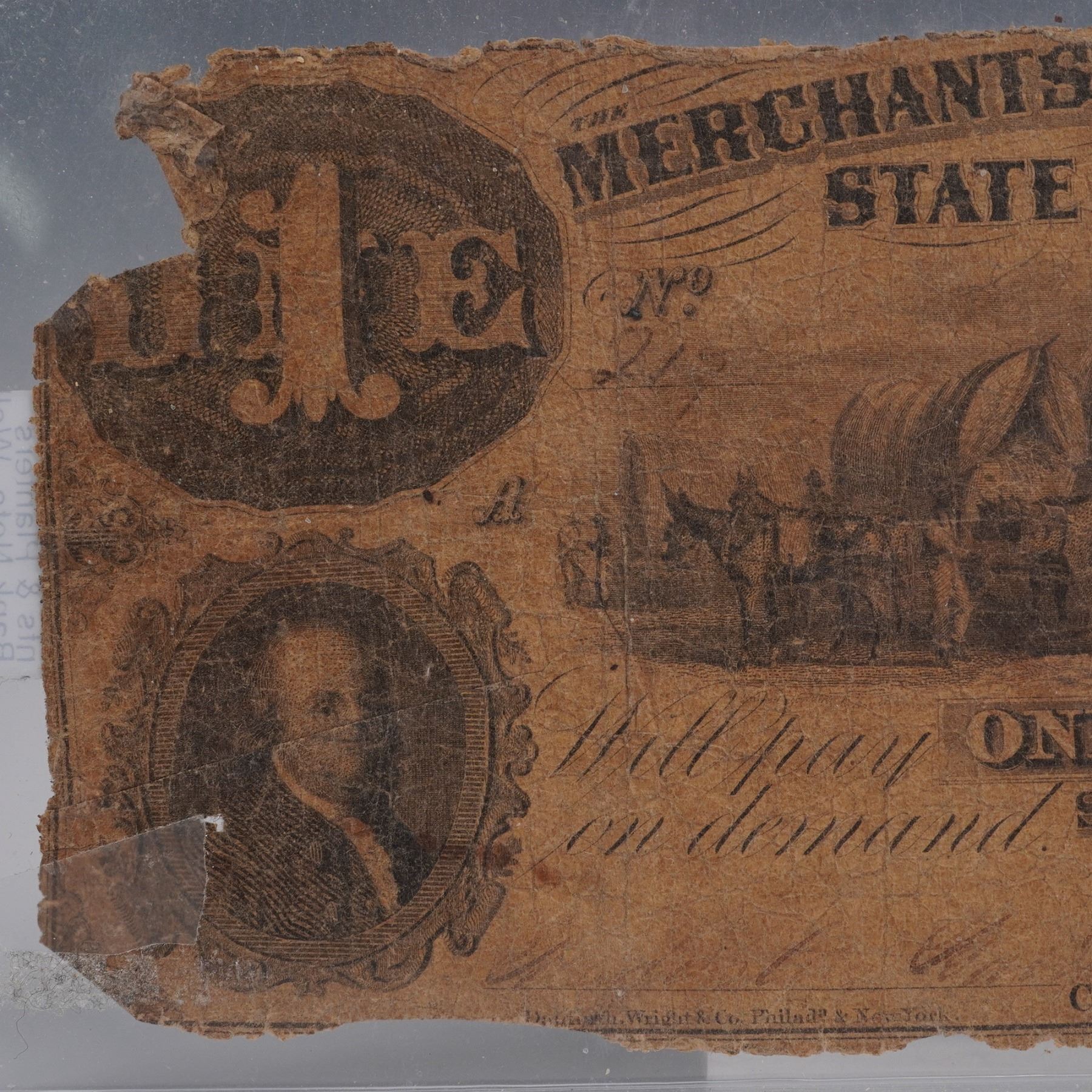 This historical, heavily worn one dollar banknote was issued by the Merchants and Planters Bank in the State of Georgia, specifically in Savannah, during the mid-19th century. Printed by Danforth, Wright & Co. The central vignette features a detailed pastoral scene of horse-drawn covered wagons, possibly referencing the agrarian commerce integral to Georgia's antebellum economy. Framing this imagery are ornate denomination counters and engraved portraits including a bearded gentleman on the lower left and a building vignette at the lower center.