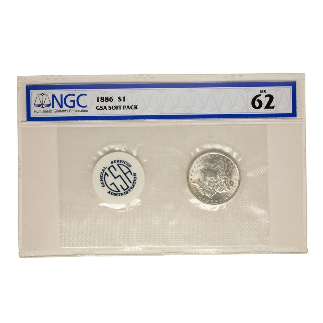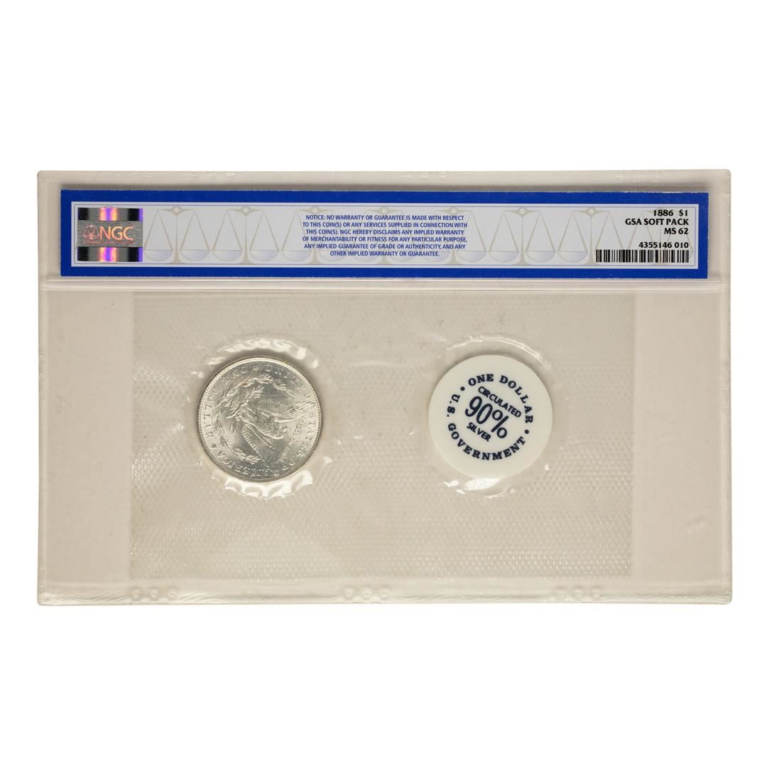 One 1886 $1 Morgan Silver Dollar Coin GSA Soft Pack NGC MS62. NGC Certified.