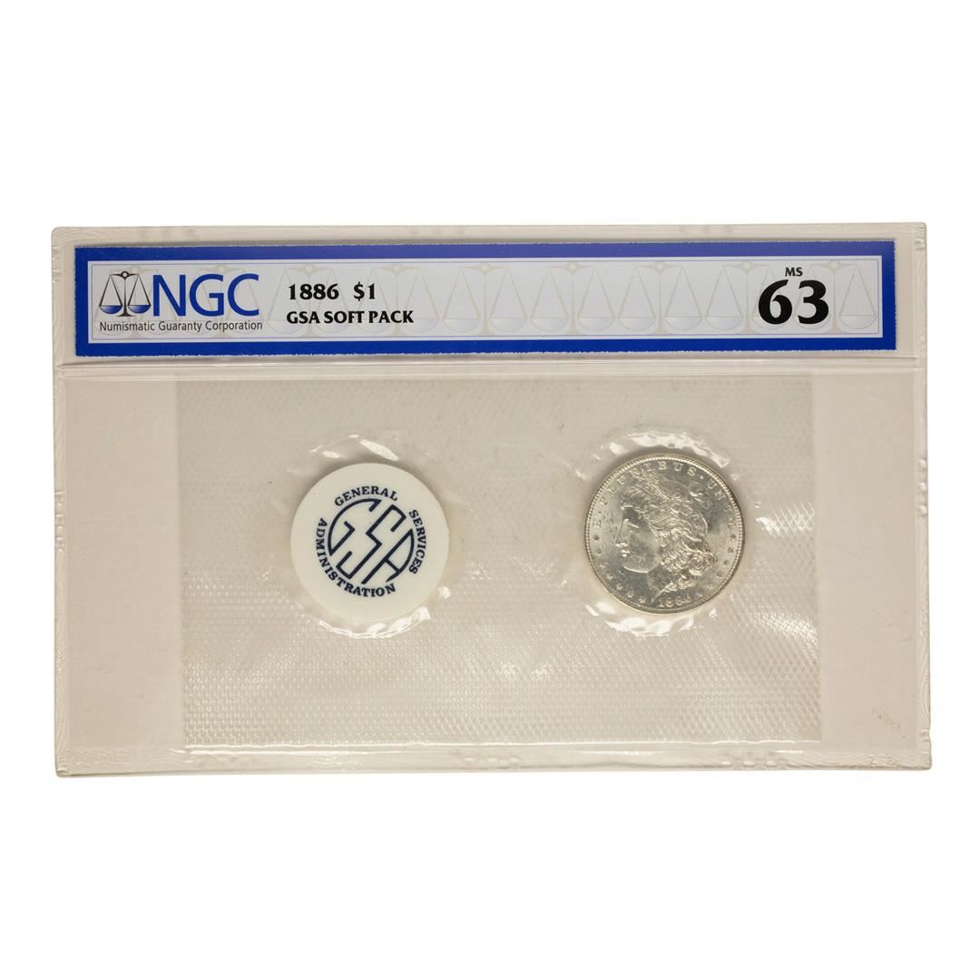 One 1886 $1 Morgan Silver Dollar Coin GSA Soft Pack NGC MS63. NGC Certified.