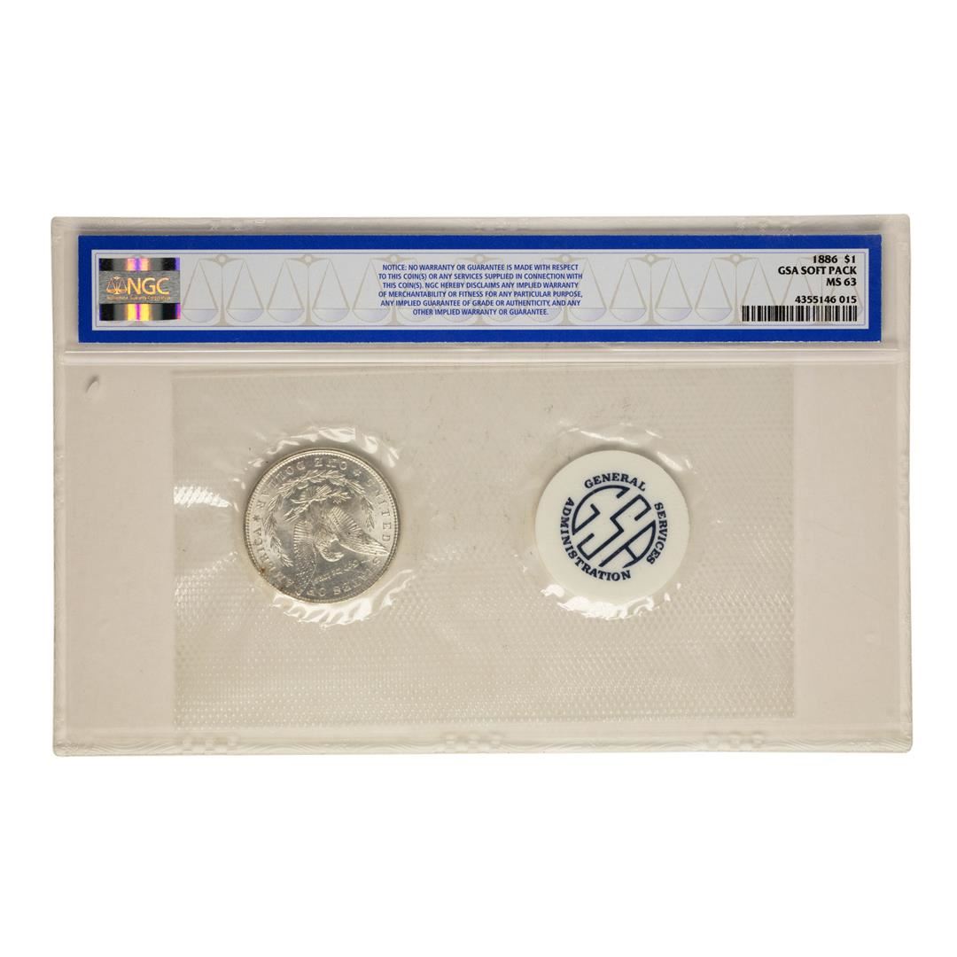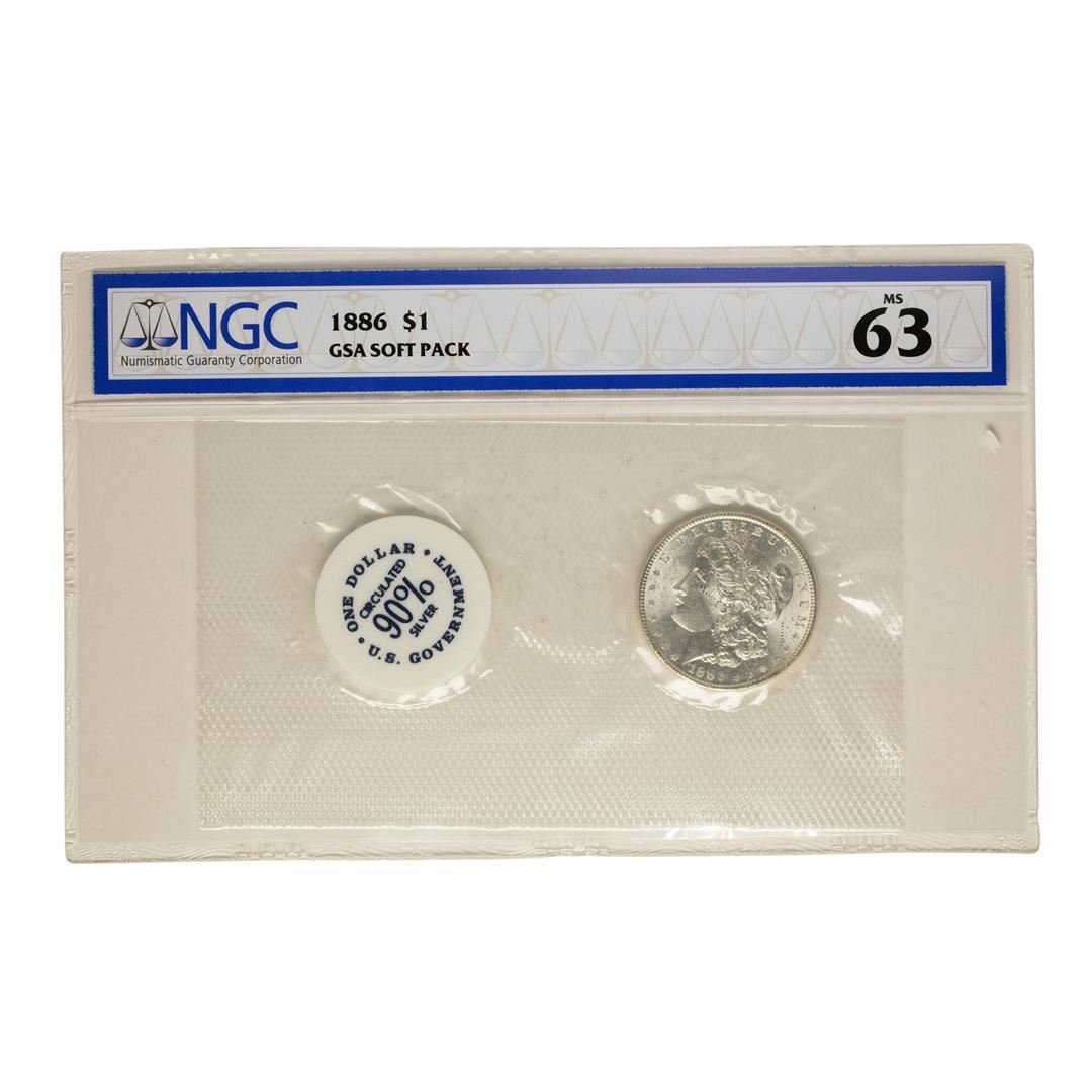 One 1886 $1 Morgan Silver Dollar Coin GSA Soft Pack NGC MS63. NGC Certified.