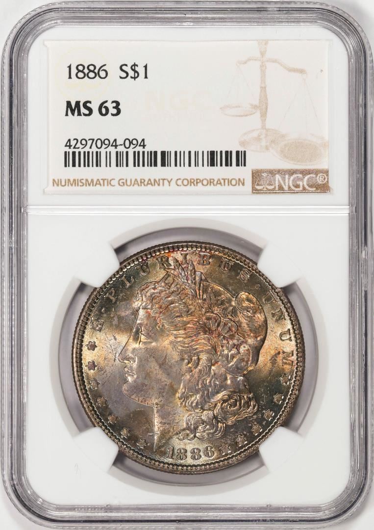One 1886 $1 Morgan Silver Dollar Coin NGC MS63 Amazing Toning. NGC Certified.