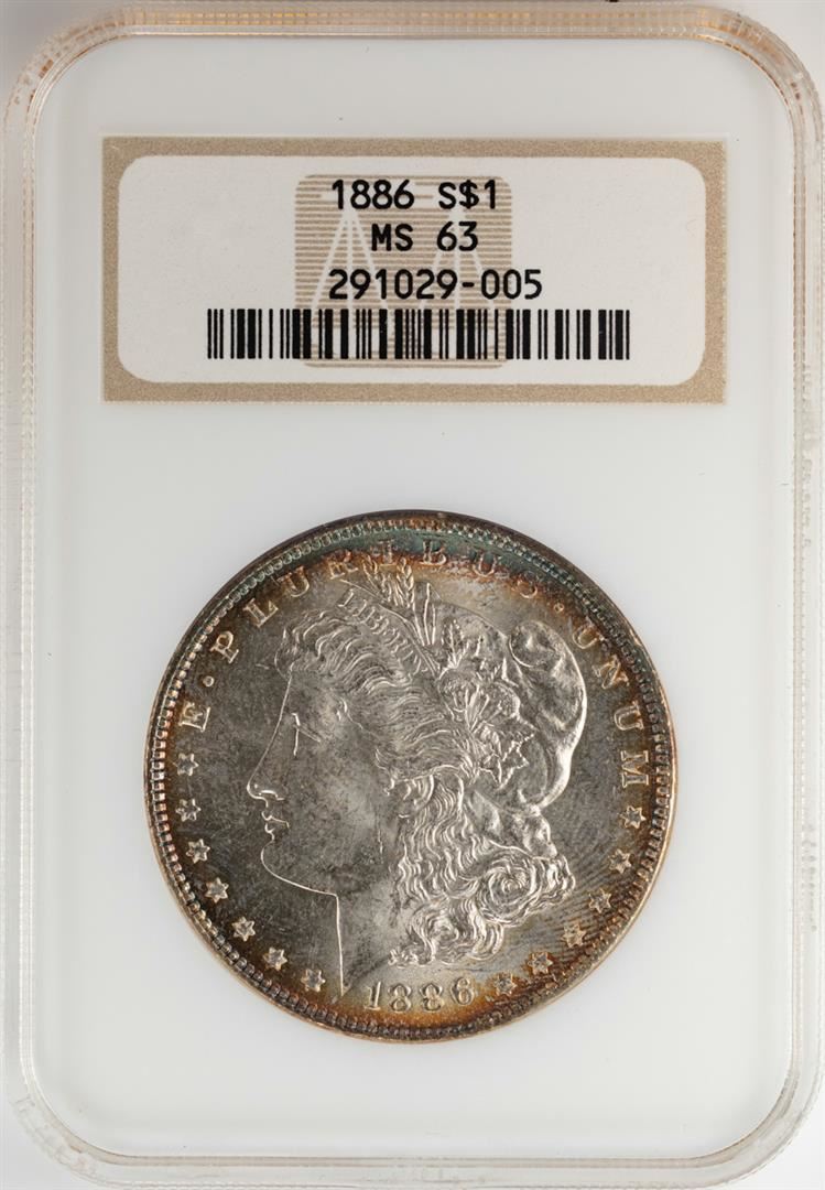 One 1886 $1 Morgan Silver Dollar Coin NGC MS63 Nice Toning Old Fatty Holder. NGC Certified.