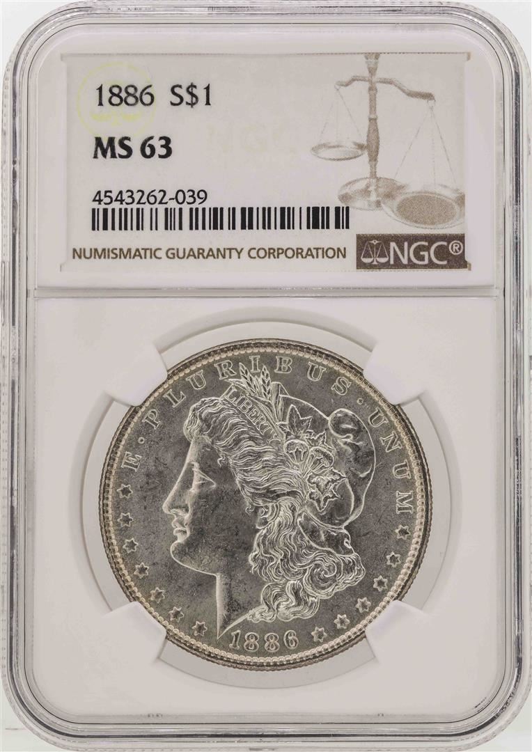 One 1886 $1 Morgan Silver Dollar Coin NGC MS63. NGC Certified.