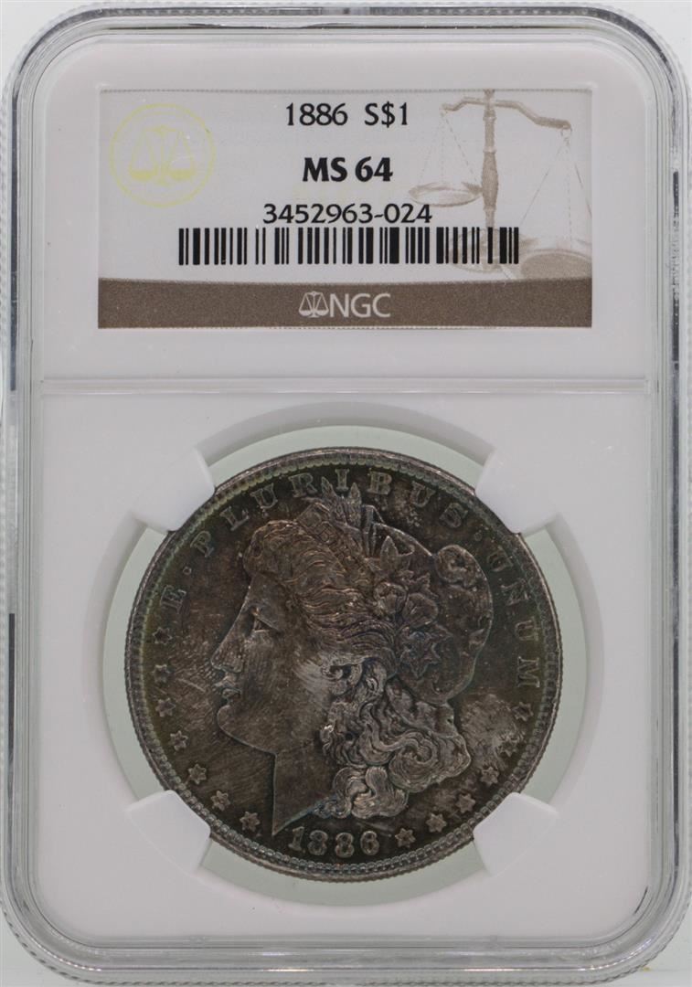 One 1886 $1 Morgan Silver Dollar Coin NGC MS64 AMAZING TONING. NGC Certified.