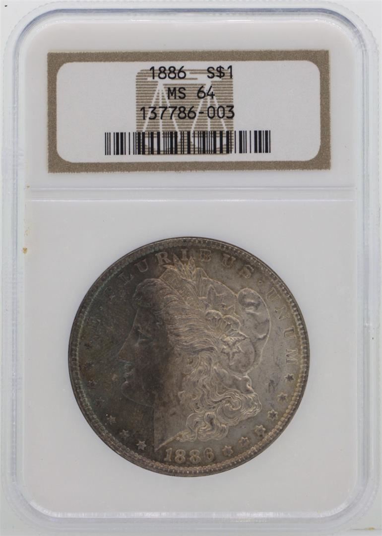 One 1886 $1 Morgan Silver Dollar Coin NGC MS64 NICE TONING. NGC Certified.