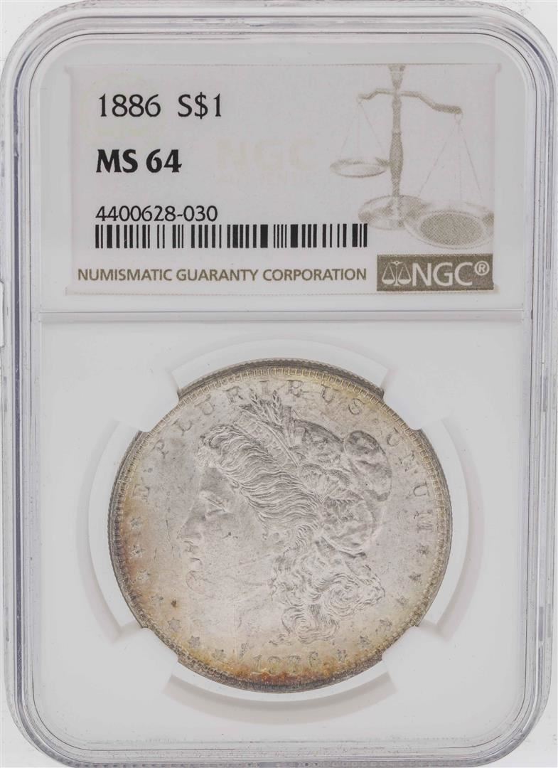 One 1886 $1 Morgan Silver Dollar Coin NGC MS64. NGC Certified.