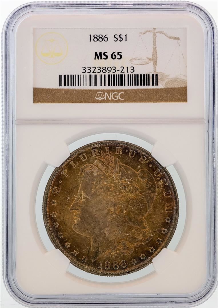 One 1886 $1 Morgan Silver Dollar Coin NGC MS65 Amazing Toning. NGC Certified.
