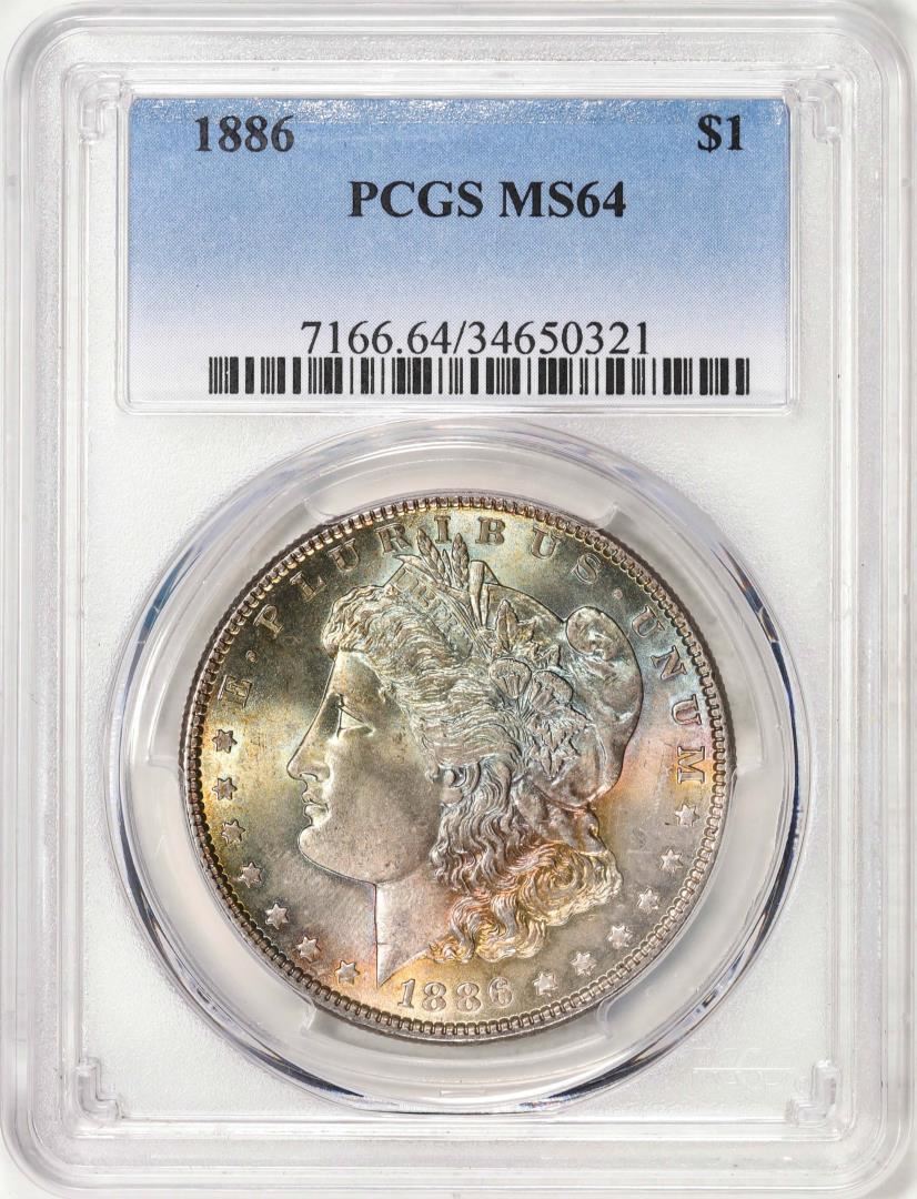One 1886 $1 Morgan Silver Dollar Coin PCGS MS64 Amazing Toning . PCGS Graded.