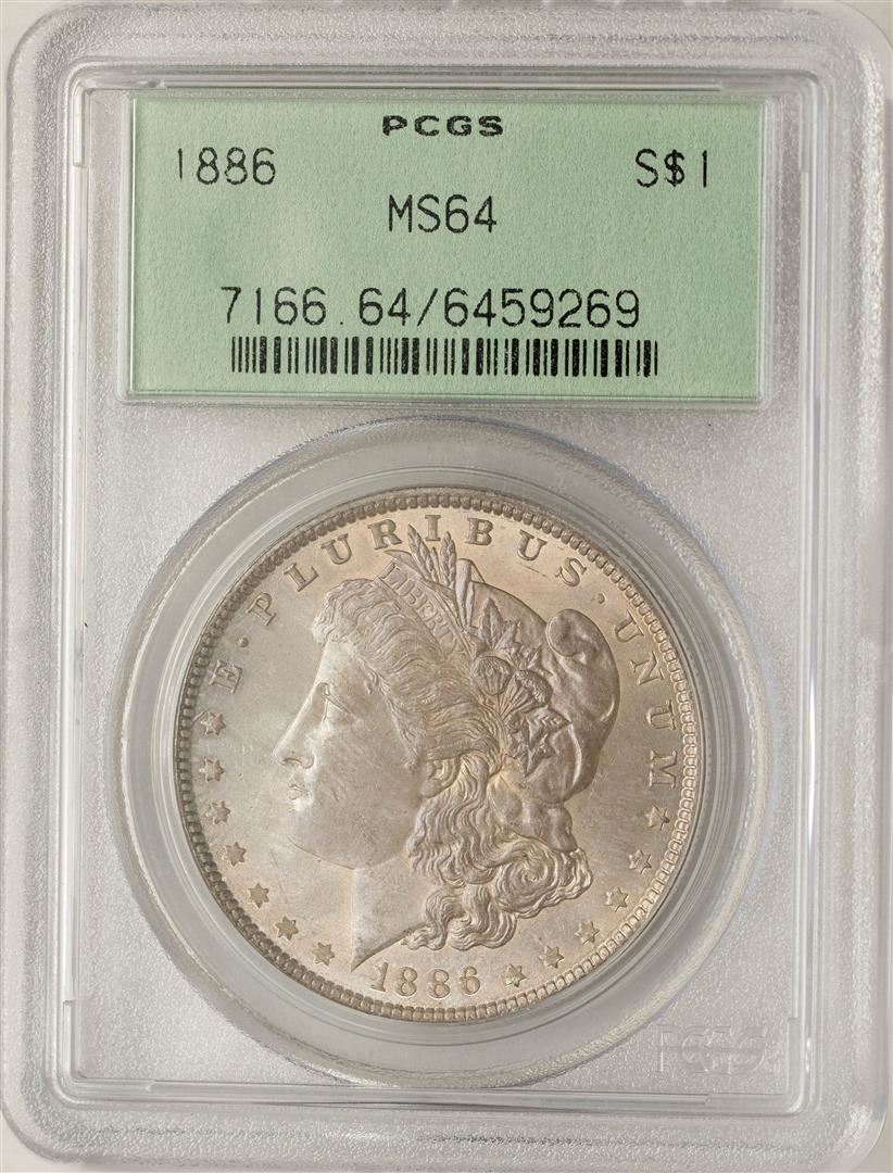 One 1886 $1 Morgan Silver Dollar Coin PCGS MS64 Old Green Holder. PCGS Graded.