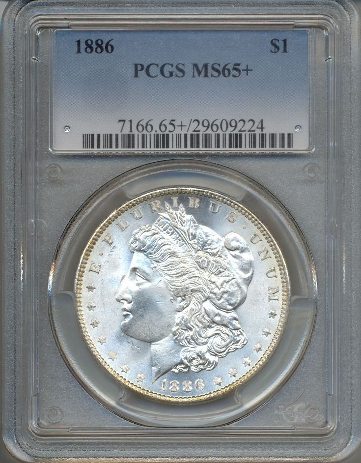 One 1886 $1 Morgan Silver Dollar Coin PCGS MS65+.
