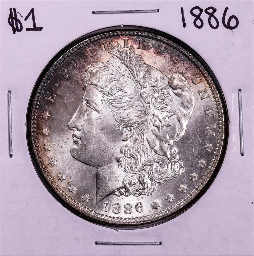 One 1886 $1 Morgan Silver Dollar Coin.