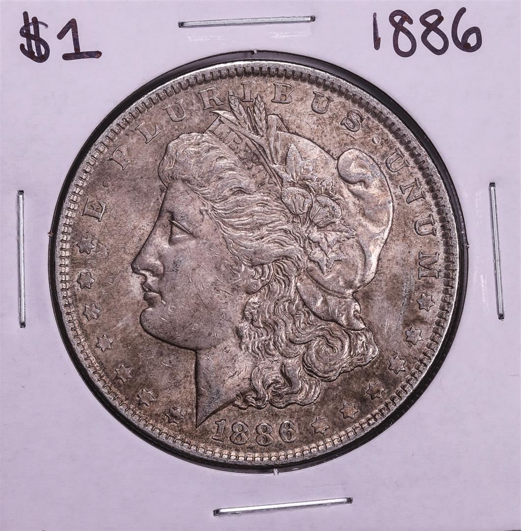 One 1886 $1 Morgan Silver Dollar Coin.