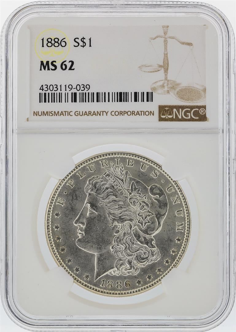 One 1886 $1 Morgan Silver Dollar NGC Graded MS62. NGC Certified.
