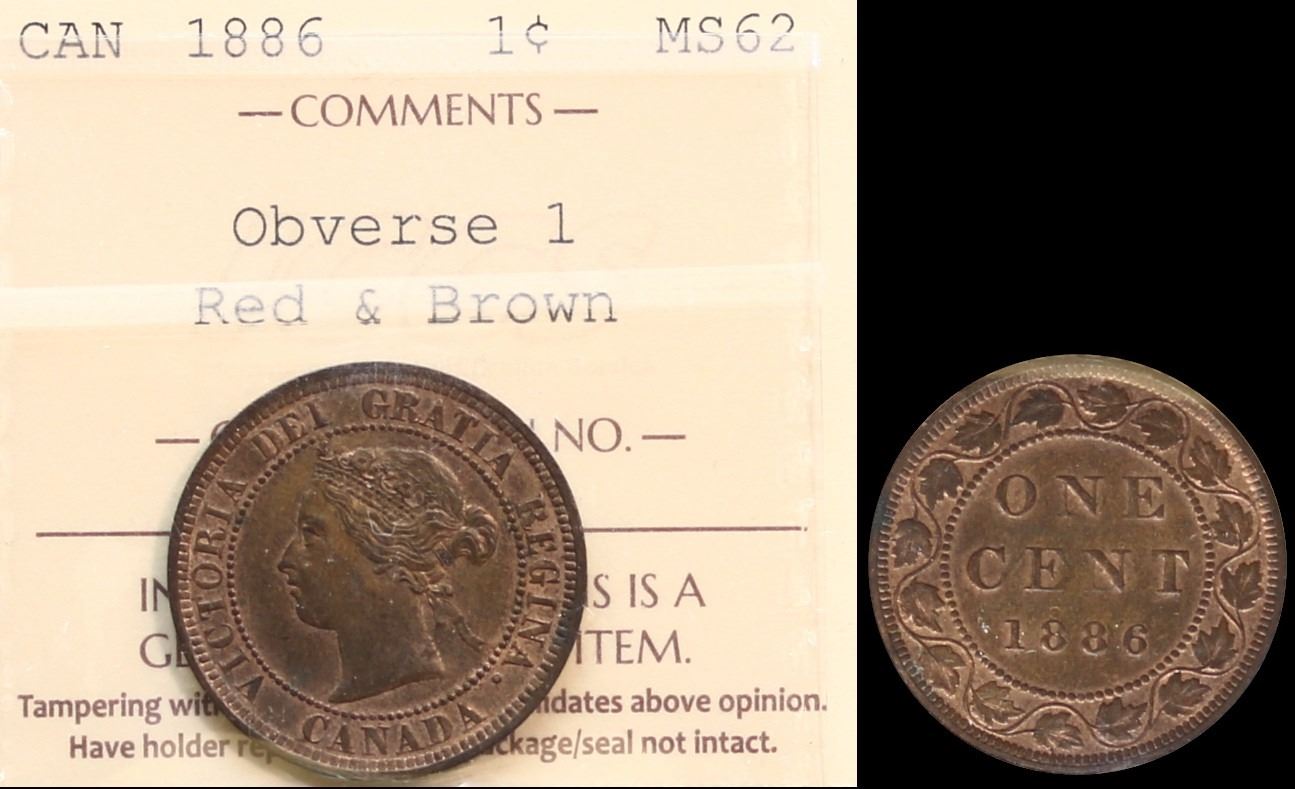 1886 1¢ Obv.1 ICCS Choice Mint State-62RB. Nice lustre.