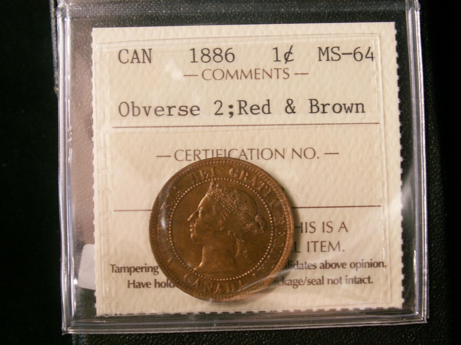 1886 1¢ Obv 2, ICCS MS64RB. Well struck and lustrous.