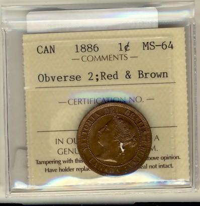 1886 1¢ Obv 2, ICCS MS64RB. Well struck and lustrous.