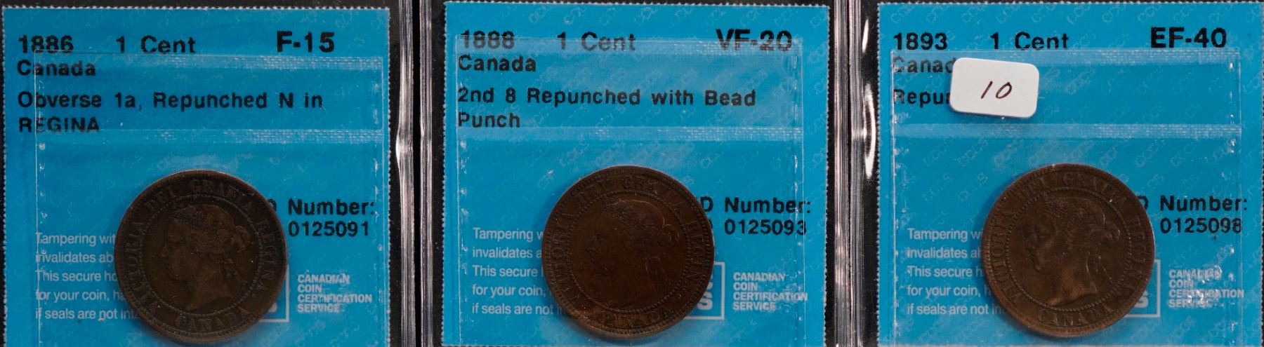1886 1¢ Obverse 1a, Repunched N in Regina Choice Fine-15, 1888 2nd 8 Repunched with Bead Punch Very Fine-20, 1893 Repunched 9 Extra Fine-40, all CCCS graded, lot of 3 coins.