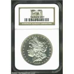 <table><tr><td><TABLE cellSpacing=0 cellPadding=0 width="100%" bgColor=#000000 border=0><TBODY> <TR><TD width="100%"><TABLE cellSpacing=1 cellPadding=3 width="100%" border=0><TBODY><TR><TD width="100%" bgColor=#79735c><FONT face=arial color=#ffffff size=3><B>Description</B> </FONT></TD></TR><TR><TD width="100%" bgColor=#ffffff><FONT face=arial size=2><B>1886 $1 PR66 NGC.</B></I> This solidly graded Gem is devoid of even a single distracting hairline. Perhaps needless to say for a Morgan Dollar at the PR66 level, contact marks are also not noticed. The crisply defined, uniformly brilliant features are essentially untoned over each side. Of this issue, Bowers (1993) states: "High level, unimpaired, uncleaned coins are rare." </FONT></TD></TR></TBODY></TABLE></TD></TR></TBODY></TABLE><BR><A name=PricesRealized></A><TABLE cellSpacing=0 cellPadding=0 width="100%" bgColor=#000000 border=0><TBODY><TR><TD width="100%"><TABLE cellSpacing=1 cellPadding=3 width="100%" border=0><TBODY><TR><TD width="100%" bgColor=#79735c><A name=PR><FONT face=arial color=#ffffff size=3><B>Previous Prices from Heritage Auctions</B> </FONT></A></TD></TR><TR><TD bgColor=#f6f6ed><TABLE cellSpacing=0 cellPadding=0 width="100%" border=1><TBODY><TR><TD align=middle width="33%"><B>Date</B></TD><TD align=middle width="33%"><B>Service</B></TD><TD align=middle width="33%"><B>Price</B></TD></TR><TR bgColor=whitesmoke><TD width="33%"><B>01/11/2003</B></TD><TD width="33%">NGC</TD><TD width="33%">$5,520.00</TD></TR><TR bgColor=whitesmoke><TD width="33%"><B>04/05/2001</B></TD><TD width="33%">PCGS</TD><TD width="33%">$5,290.00</TD></TR><TR bgColor=whitesmoke><TD width="33%"><B>07/31/1993</B></TD><TD width="33%">NGC</TD><TD width="33%">$4,840.00</TD></TR><TR bgColor=whitesmoke><TD width="33%"><B>07/01/1997</B></TD><TD width="33%">PCGS</TD><TD width="33%">$5,720.00</TD></TR><TR bgColor=whitesmoke><TD width="33%"><B>06/01/1999</B></TD><TD width="33%">NGC</TD><TD width="33%">$4,400.00</TD></TR></TBODY></TABLE></TD></TR><TR><TD bgColor=#ffffff><FONT face=arial size=1 ?>PLEASE NOTE: All prices realized reflect the final hammer price PLUS the buyer's premium in auctions that charge a buyer's premium. Each item has a notation at the top of the listing indicating whether that lot included a buyer's premium. Example: A item that sells with a final hammer price of $100 and a 20% buyer's premium will display with a price realized of $120. All information listed is intended to be as accurate as possible, but errors are possible. Please use this guide carefully and inform us of any inaccuracies. </FONT></TD></TR></TBODY></TABLE></TD></TR></TBODY></TABLE><BR><TABLE cellSpacing=0 cellPadding=0 width="100%" bgColor=#000000 border=0><TBODY><TR><TD width="100%"><TABLE cellSpacing=1 cellPadding=3 width="100%" border=0><TBODY><TR><TD width="100%" bgColor=#79735c colSpan=6><FONT face=arial color=#ffffff size=3><B>Price Guide*</B> </FONT></TD></TR><TR bgColor=#f6f6ed><TD align=middle><B>Grade</B> </TD><TD align=middle><B>Coin World<BR>(Trends)</B> </TD><TD align=middle><B>Numismedia<BR>Retail</B> </TD><TD align=middle><B>Numismedia<BR>Wholesale</B> </TD><TD align=middle><B>Coin<BR>Universe</B> </TD><TD align=middle><B>Heritage<BR>Value Index</B> </TD></TR><TR bgColor=#ffffff><TD align=middle>65</TD><TD align=right>---</TD><TD align=right>---</TD><TD align=right>$4,325.00</TD><TD align=right>$6,850.00</TD><TD align=right>$4,287.50</TD></TR><TR style="FONT-WEIGHT: bold" bgColor=#cccfdd><TD align=middle>66</TD><TD align=right>---</TD><TD align=right>---</TD><TD align=right>$5,750.00</TD><TD align=right>$10,500.00</TD><TD align=right>$7,350.00</TD></TR><TR bgColor=#ffffff><TD align=middle>67</TD><TD align=right>---</TD><TD align=right>---</TD><TD align=right>$9,950.00</TD><TD align=right>---</TD><TD align=right>---</TD></TR><TR bgColor=#ffffff><TD colSpan=6><FONT size=1>*All information listed is intended to be as accurate as possible, but errors are possible. No item may be returned or refused based on this information which is provided as a service to our customers. You should contact each pricing source directly to determine the accuracy of this information. </FONT></TD></TR></TBODY></TABLE></TD></TR></TBODY></TABLE><BR><TABLE cellSpacing=0 cellPadding=0 width="100%" bgColor=#000000 border=0><TBODY><TR><TD width="100%"><TABLE cellSpacing=1 cellPadding=3 width="100%" border=0><TBODY><TR><TD width="100%" bgColor=#79735c><FONT face=arial color=#ffffff size=3><B>Population Guide</B> </FONT></TD></TR><TR bgColor=#ffffff><TD align=middle><!-- Begin Output of Population Grid--><TABLE cellSpacing=0 cellPadding=0 width="100%" border=0><TBODY><TR><TD vAlign=center><TABLE cellSpacing=0 width="100%" border=1 cellsadding="3"><TBODY><TR><TD vAlign=center><TABLE cellSpacing=0 cellPadding=3 width="100%" border=1><TBODY><TR><TD vAlign=center align=middle bgColor=#f0f1e8 colSpan=2 <CENTER><FONT face=Arial size=2><B>PCGS Pop </B></FONT><CENTER></CENTER></TD><TD vAlign=center align=middle bgColor=#f0f1e8 colSpan=2><CENTER><FONT face=Arial size=2><B>NGC Pop</B></CENTER></FONT></TD></TR><TR><TD vAlign=center><FONT face=Arial size=2>(66)</FONT> </TD><TD vAlign=center align=right><FONT face=Arial size=2>14</FONT> </TD><TD vAlign=center><FONT face=Arial size=2>(66)</FONT> </TD><TD vAlign=center align=right><FONT face=Arial size=2>24</FONT> </TD></TR><TR><TD vAlign=center><FONT face=Arial size=2>(>66)</FONT> </TD><TD vAlign=center align=right><FONT face=Arial size=2>5</FONT> </TD><TD vAlign=center><FONT face=Arial size=2>(>66)</FONT> </TD><TD vAlign=center align=right><FONT face=Arial size=2>11</FONT> </TD></TR></TBODY></TABLE></TD></TR></TBODY></TABLE></TD></TR></TBODY></TABLE><!-- End Output of Population Grid--></TD></TR></TBODY></TABLE></TD></TR></TBODY></TABLE><BR><TABLE cellSpacing=0 cellPadding=0 width="100%" bgColor=#000000 border=0><TBODY><TR> Important notice: Heritage usually auctions material at the rate of 200-250 lots per hour. On some occasions eBay Live bid software