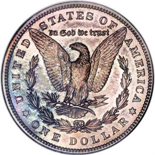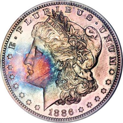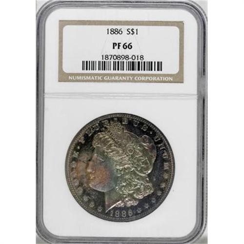 <B>1886 $1 PR66 NGC.</B></I> Deep layers of plum, electric-green, and purple-rose toning cover both sides of this conditionally scarce specimen. Intense reflectivity exists in the fields, and the design details are crisply reproduced. According to Bowers (1993): "High level, unimpaired, uncleaned coins are rare." Census: 28 in 66, 9 finer (2/08).<BR><I>From The Queller Family Collection of Silver Dollars.</B></I><BR><BR><B>Coin Engraver:</B> George T. Morgan<BR><BR><b>Shipping:</b> Coins & Currency (<a target="_blank" href="http://www.heritageauctions.com/common/shipping.php">view shipping information</a>)