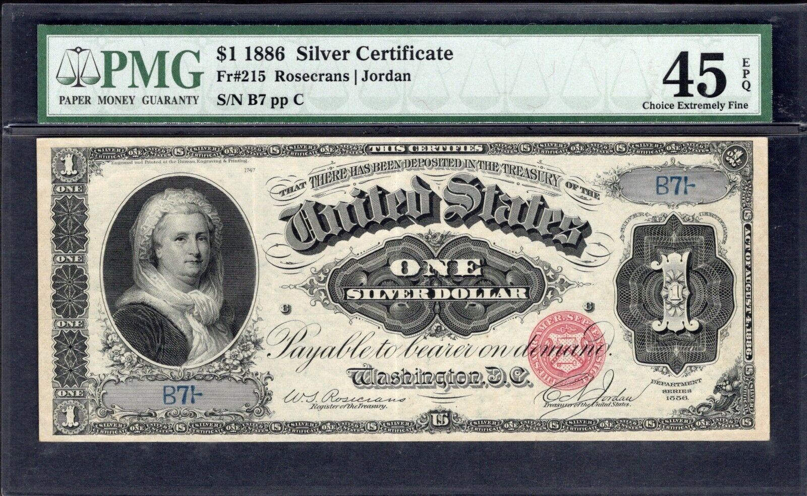 1886 $1 Serial 7 Martha Washington Silver Cert PMG 45EPQ. Serial Number 7.