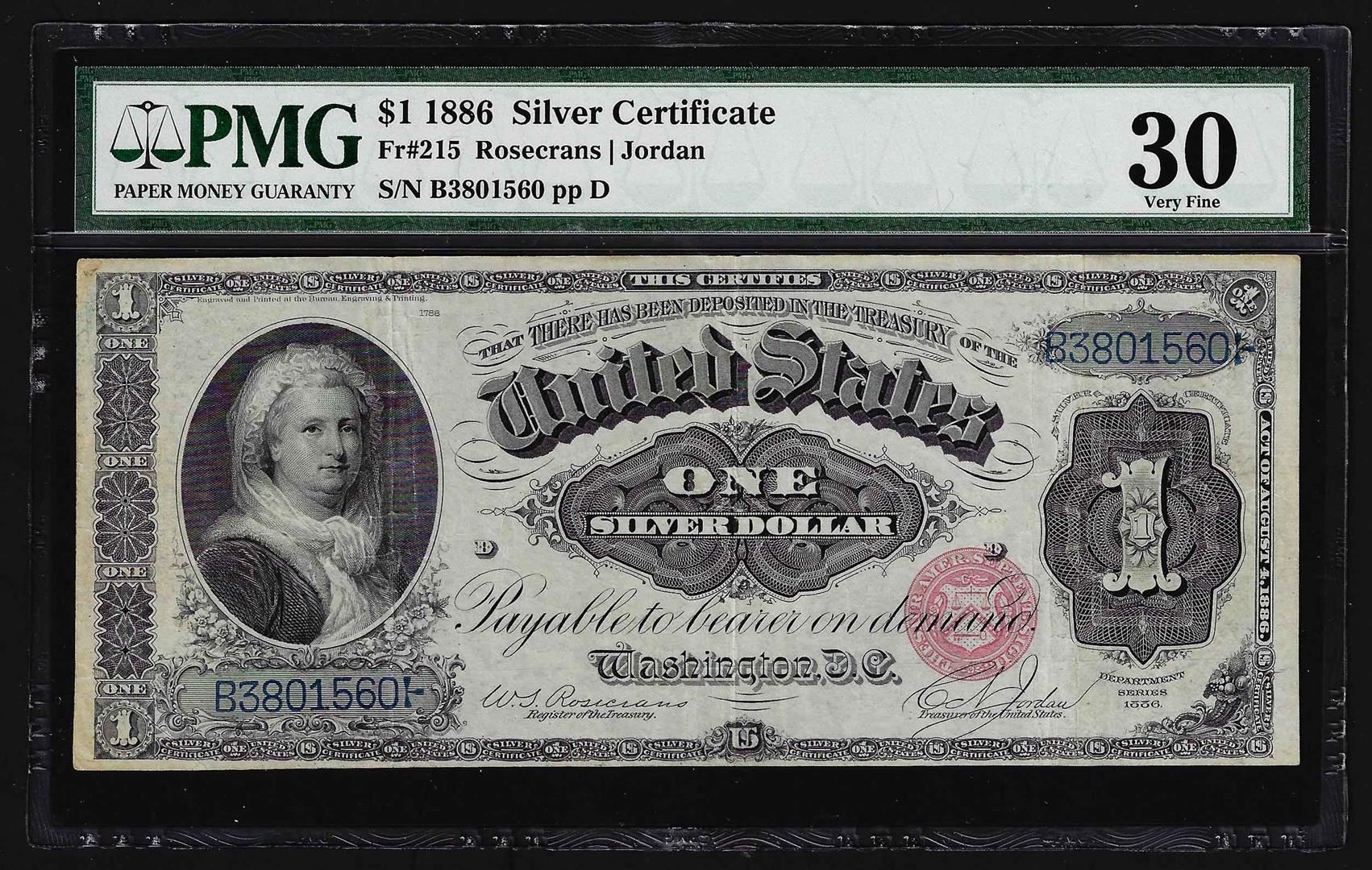 One 1886 $1 Silver Certificate Martha Washington Note PMG Very Fine 30. PMG Certified.