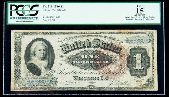 1886, $1 Silver Certificate. PCGS Apparent Fine 15. . Fr-219. As mentioned on the holder, there are some small edge tears and some minor stains. Still, not a bad looking Martha for the grade.