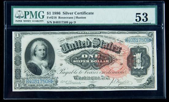 1886, $1 Silver Certificate. PMG About Uncirculated 53. . Fr-218. Martha Washington remains the only actual historical woman pictured on United States currency. The top margin is trimmed a little unevenly, otherwise the eye appeal is very nice overall.