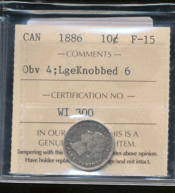 1886 10¢ Large Knobbed 6 Obv. 4 ICCS Fine 15. Light tone.