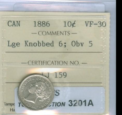 1886 10¢ Large, knob 6 variety. ICCS VF-30. Lightly toned.