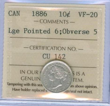 1886 10¢ Lg 6 Ptd Obv.#5 ICCS VF20 Brilliant!