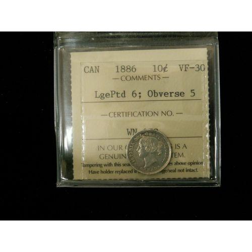 1886 10¢ Lg Ptd, Obv 5 ICCS VF30, very popula