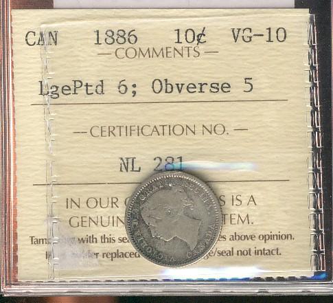 1886 10¢ LgPtd 6 Obv 5 ICCS VG10.
